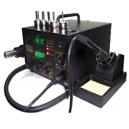 La Estación de Soldadura BAKU 702B es una unidad profesional multifunción que combina un cautín de alta precisión y una pistola de aire caliente, ideal para reparación, mantenimiento y ensamblaje de equipos electrónicos. Ofrece control digital de temperatura, calentamiento rápido y un flujo de aire estable que facilita la manipulación de componentes SMD y circuitos delicados. Su diseño robusto y ergonómico garantiza comodidad y seguridad durante el uso, mientras que su desempeño confiable la convierte en una herramienta indispensable para técnicos, talleres y aficionados avanzados en electrónica.