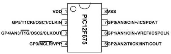 El Microchip PIC12F675 es un microcontrolador de 8 bits compacto y versátil, ideal para aplicaciones de automatización, control de sensores y proyectos educativos. Cuenta con una memoria Flash de 1.75 KB, 64 bytes de RAM y 128 bytes de EEPROM, ofreciendo almacenamiento suficiente para programas y datos. Opera con un oscilador interno de 4 MHz, eliminando la necesidad de componentes externos, y admite una frecuencia de hasta 20 MHz con un oscilador externo. Su convertidor analógico a digital (ADC) de 10 bits con 4 canales permite una lectura precisa de señales analógicas. Además, incluye temporizadores de 8 y 16 bits, un comparador analógico y características como detección de bajo voltaje y temporizador de vigilancia (WDT). Con 6 pines de entrada/salida configurables, es compatible con entornos de desarrollo como MPLAB X y herramientas de programación como PICkit, facilitando su integración en diversos proyectos electrónicos.