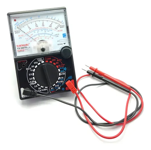El multímetro analógico YX-360TR de Sanwa es una herramienta de medición confiable y versátil, ampliamente utilizada en laboratorios, talleres y entornos educativos. Equipado con una escala de aguja de fácil lectura, permite medir voltajes de corriente continua (DC) y alterna (AC), corriente DC, resistencia y realizar pruebas de continuidad y diodos. Su diseño robusto y compacto lo hace ideal para trabajos de campo o de banco, brindando lecturas rápidas sin la necesidad de alimentación electrónica. Gracias a su alta sensibilidad y precisión en bajas corrientes, sigue siendo una opción preferida por técnicos y estudiantes que valoran la retroalimentación visual inmediata y la simplicidad de operación.