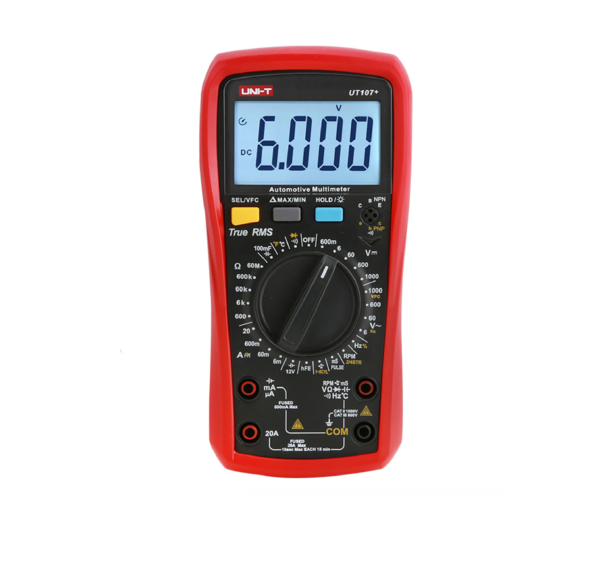 Herramienta especializada para el diagnóstico de sistemas eléctricos en vehículos. Permite medir voltaje, corriente, resistencia, RPM, ciclo de trabajo y temperatura. Cuenta con pantalla LCD de fácil lectura, función de retención de datos y diseño resistente, siendo ideal para mecánicos y técnicos automotrices.